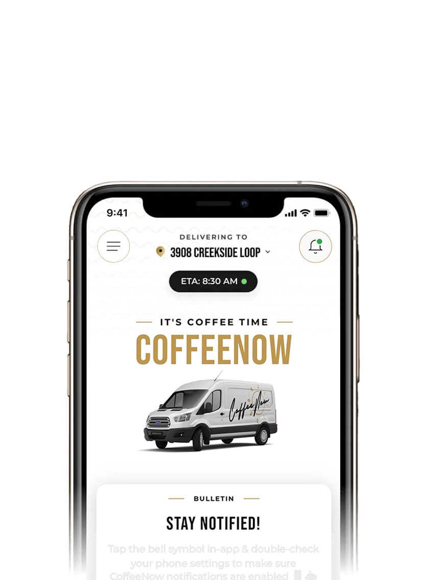 Route-based delivery is CoffeeNow’s way of providing routine consistent delivery for your workplace. Your location will be placed onto an organized delivery route ran by one of our mobile vans. Each stop receives their own delivery ETA and can track their van utilizing our in-app tracking software!